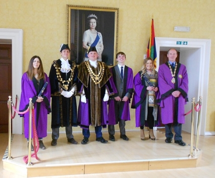 Pictured are (left to right): Melissa Grieve (newly admitted Freeman), Mr Liam Mutch (Sheriff), Councillor Gregah Roughead (Town Mayor), Richard Herriott (newly admitted Freeman), Siobhan Brady (newly admitted Freeman) and Mr Michael Herriott (Chairman of the Guild).